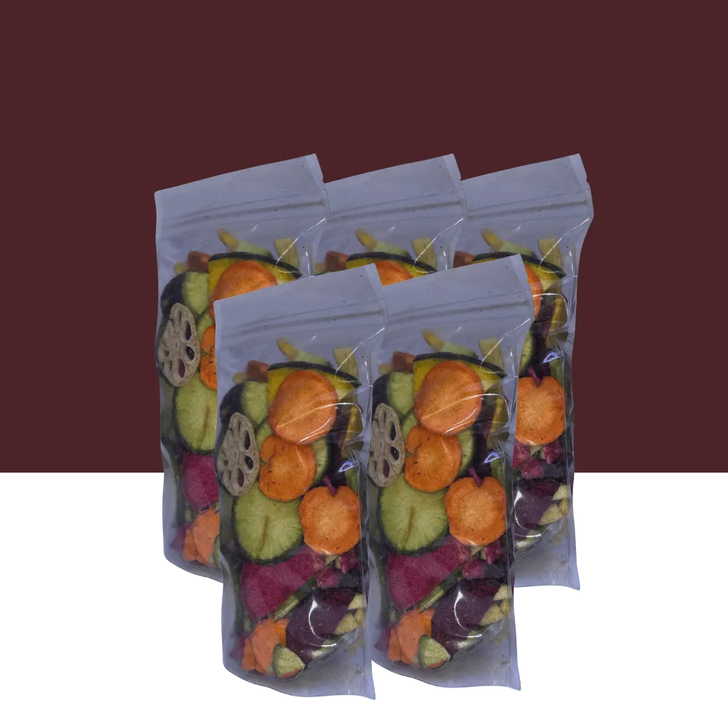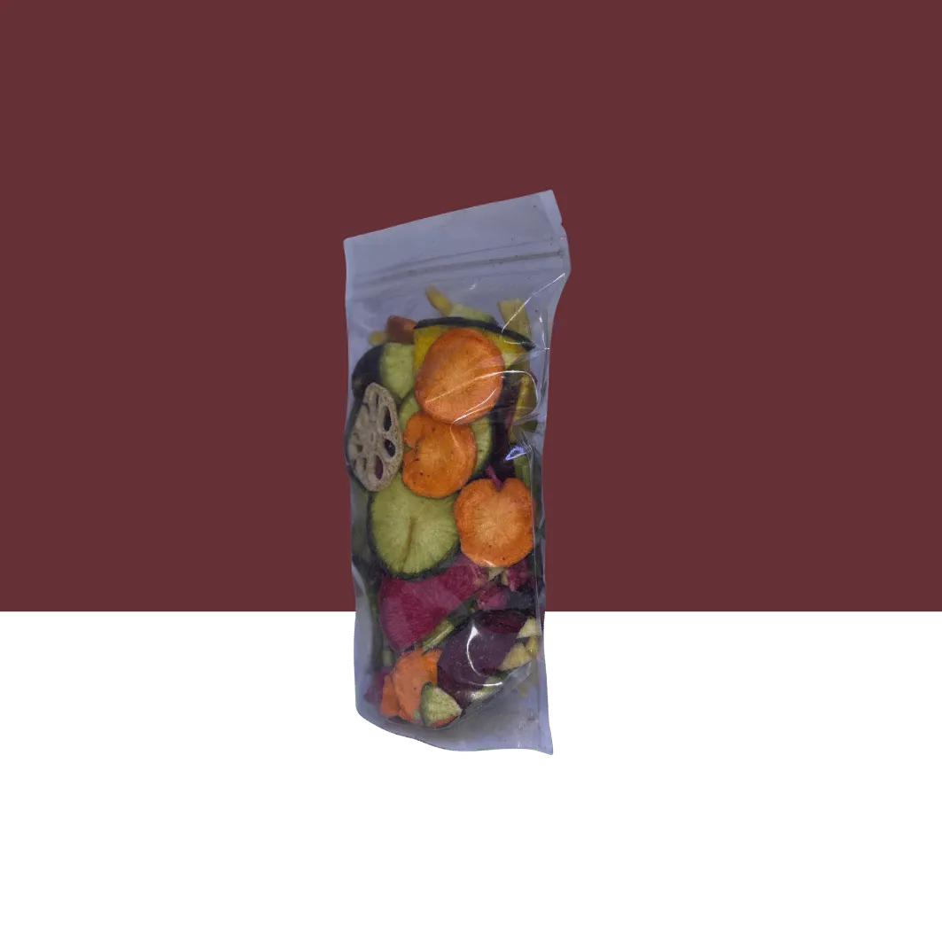 مزيج لذيذ من الجزر، البازلاء، الذرة، الفلفل الأحمر، البروكلي، والكوسة، مجففة بطريقة تحافظ على طعمها الطبيعي وقيمتها الغذائية..